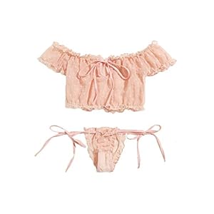 SheIn Women’s Self Tie Ruffle Trim Dobby Mesh Lingerie Set Sexy Bra And Panty